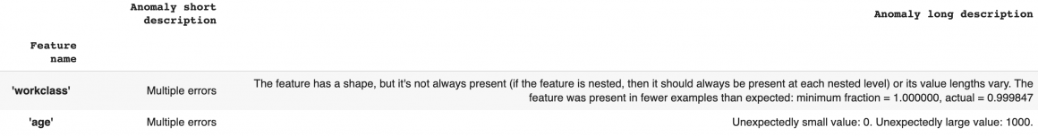 tfdv.display_anomalies(anomalies)You should see only two problems remain: