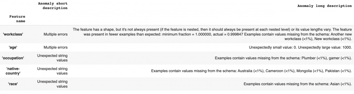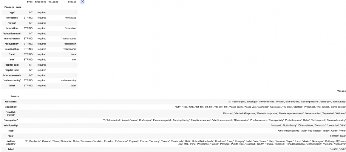 - workclass: some datapoints are missing this value, and there are 2 values that are not in feature domain in Schema;