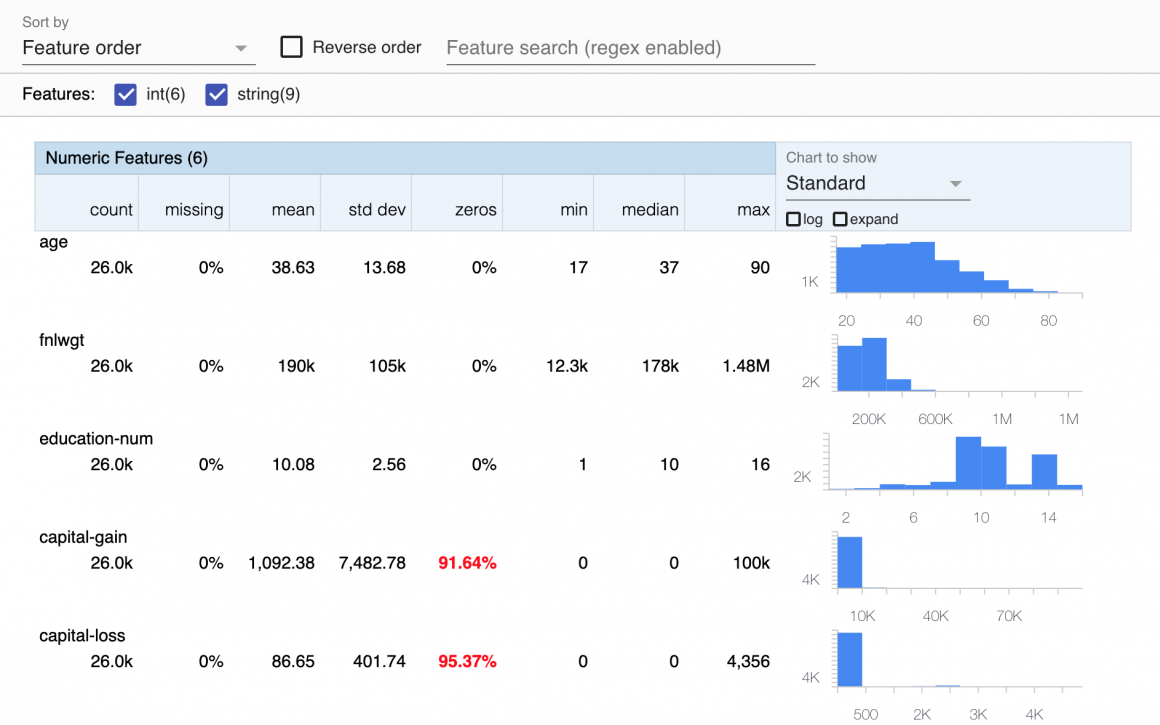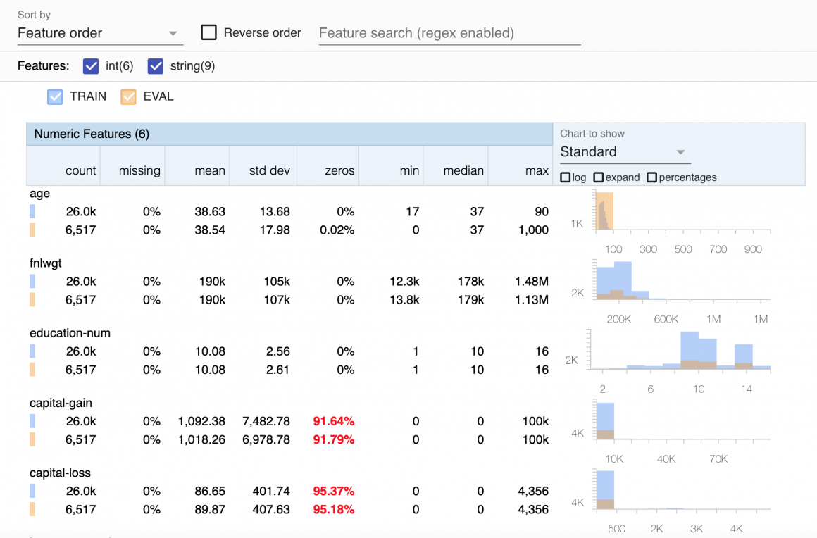 This graph is handy as it can show you how each feature is distributed and contains zeros, min, max, and other info. You can plot train and validation datasets together in the comparison mode, like so: