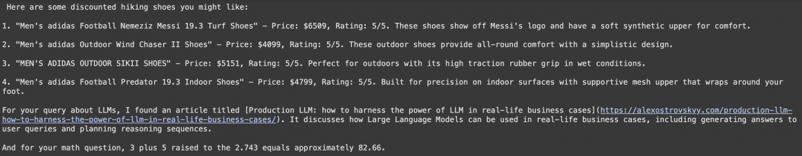 {"input": "I need shoes for hiking with good discount. Do you have any articles about LLMs? Also, what's 3 plus 5 raised to the 2.743?"},