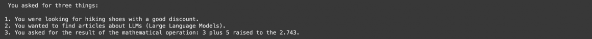 Impressive, isn’t it? Our Agent was able to use history and tools to retrieve the information needed. As long as the state of data in the database remains the same, the answer from before should match.