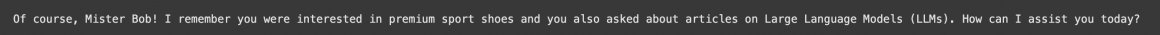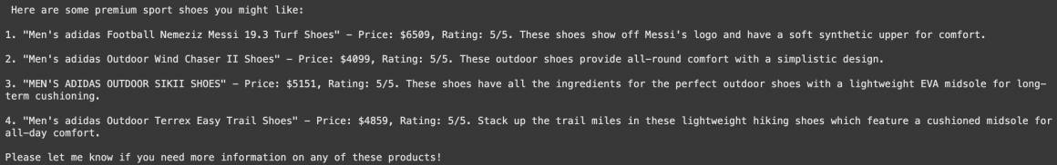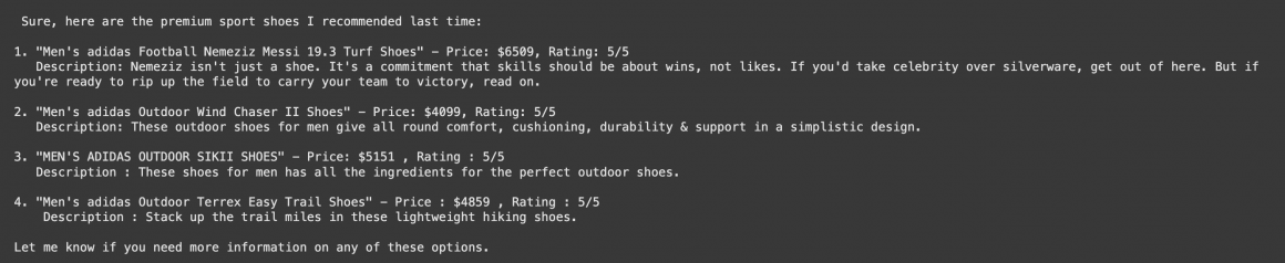 Next, we can test how well our Agent can navigate conversational memory. We can ask a question about shoes we were asking about before, and our Agent should understand that we are likely interested in the last shoe-related question rather than the previous one.