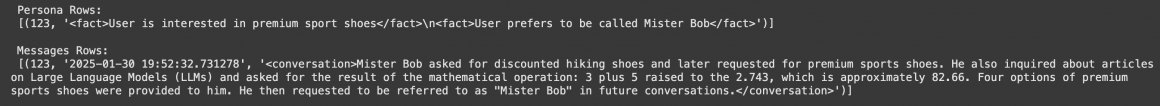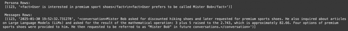 update_user_facts_from_conversation(user_id, chat_store[(user_id, conversation_id)].messages)Let’s check the entries:
