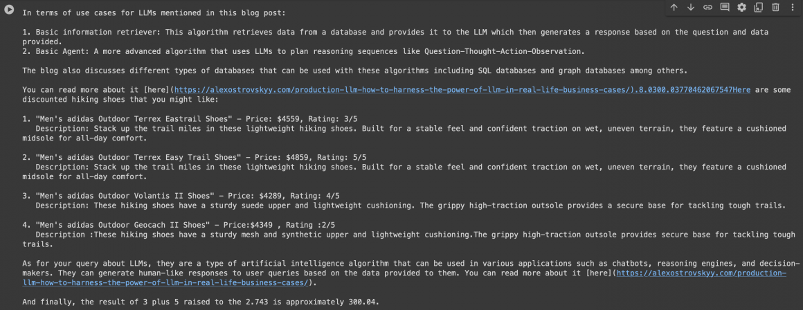 result = agent_executor.stream({"input": "I need shoes for hiking with good discount. Do you have any articles about LLMs? Also, what's 3 plus 5 raised to the 2.743?", })