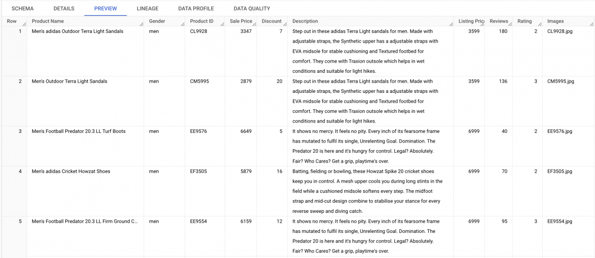 I will be using a table which contains a list of products. Specifically, shoes, stored in the Bigquery table, which looks like the following: