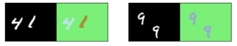 On the left of the picture above, you see the black and white input image containing two numbers: one and six. On the right side of the image, you see the same image with the segmentation mask applied to it. Basically, the model tells apart different numbers on one picture. But it does so by color-coding each pixel into a specific color unique for each digit.
