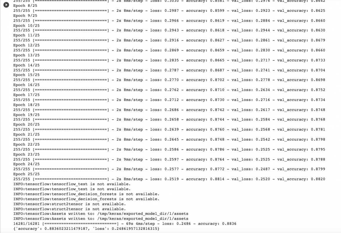 pprint.pprint(results)After running the cell above, colab (or your local/cloud environment) will train the model for 25 epochs, evaluate it, and export it for deployment. You should see results similar to below: