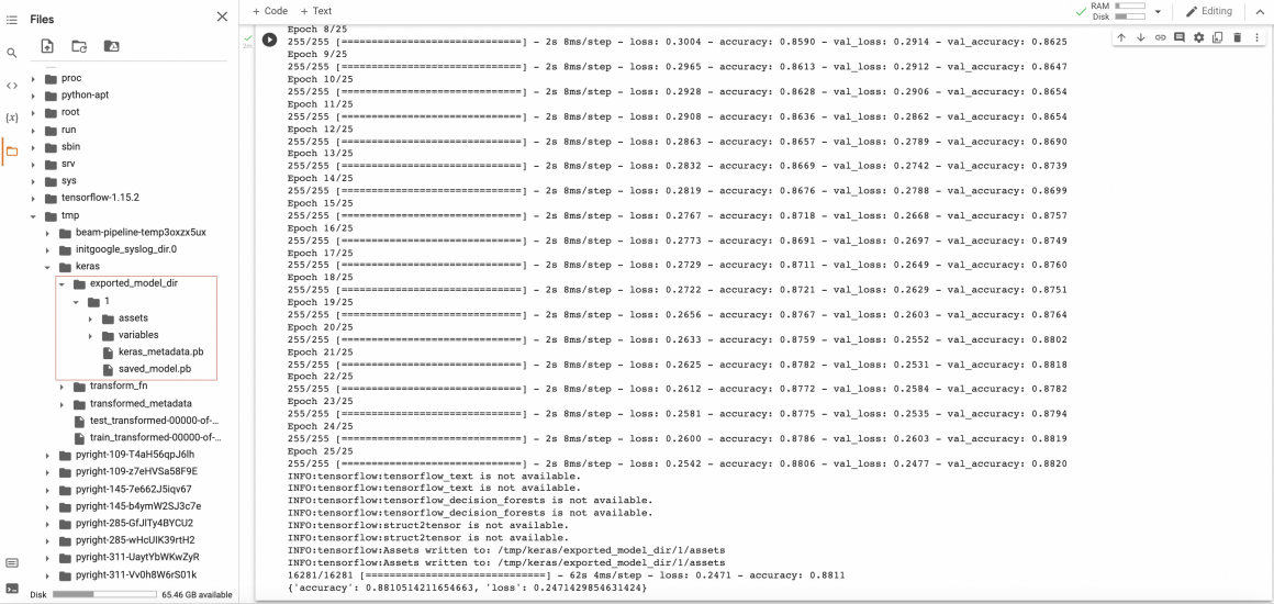 You can see the exported model in the ‘tmp/keras/exported_model_dir/1/’ folder.