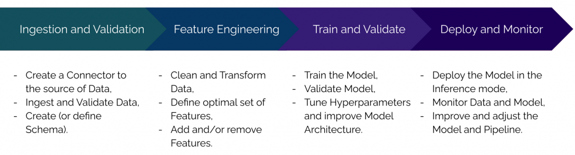 Production Machine Learning contains a few critical aspects: Data Ingestion and Validation, Feature Engineering, Model Training and Validation, and Deployment and Monitoring.